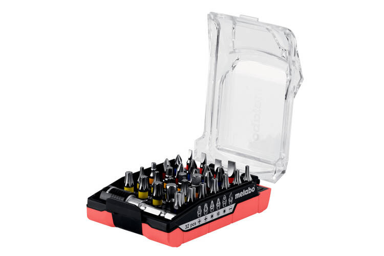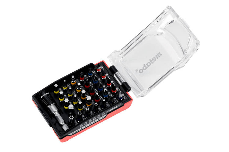 - Bity ze stali chromowo-wanadowej (o jakości S2) z oznaczeniem barwnym umożliwiającym szybkie i łatwe odnalezienie właściwego bitu; magnetyczny adapter do szybkiej wymiany;